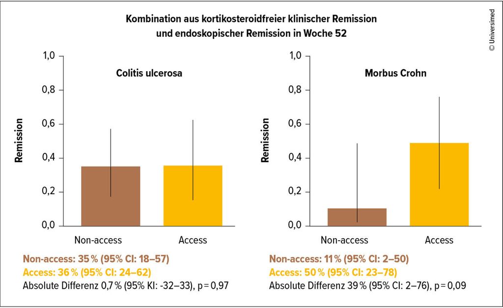 Von den 157 Patient:innen, die in die Access-Gruppe randomisiert wurden, wiesen 24 (15%) ein Hochrisikoprofil auf. Eine nach dem Ende der Studie durchgeführte Analyse der Baselinedaten fand bei 29 von 156 (19%) der Patient:innen in der Non-access-Gruppe ein Hochrisikoprofil. Bei 15 dieser Patient:innen (55%) wurde nach einer medianen Zeitspanne von 15 Tagen eine aggressive Therapie initiiert. Den primären Endpunkt erreichten 10 von 24 Patient:innen (42%) in der „top down“ behandelten Patient:innen der Access-Gruppe sowie 8/29 (27%) der Patient:innen in der Non-access-Gruppe. Mit einer absoluten Differenz von 15% (95%CI: 11–41, p=0,26) war dieser Vorteil jedoch nicht signifikant. Auch die Raten der endoskopischen Remission waren in beiden Armen vergleichbar (53% vs. 53%, p=0,99). Das mediane kumulative Kortisonäquivalent lag in der Top-down-Gruppe bei 1232mg im Vergleich zu 1651mg unter Standardtherapie (p=0,07).