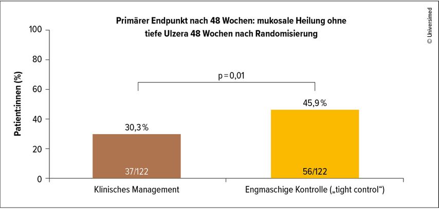 Abb. 1: Ergebnis der CALM-Studie: Ein signifikant höherer Anteil der Patient:innen in der „Tight control“-Gruppe erreichte den primären Endpunkt im Vergleich zur Gruppe mit rein klinischem Management (modifiziert nach Colombel JF et al. 2017)2