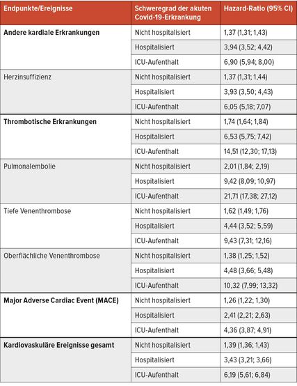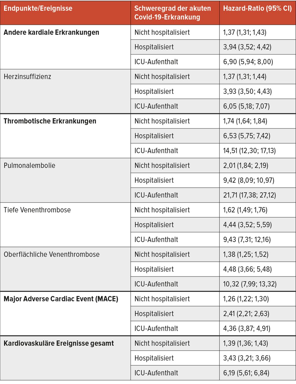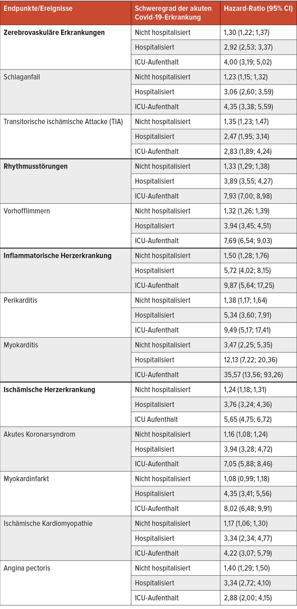 Mögliche Pathomechanismen für LongCovid mit kardiovaskulärer Symptomatik sind die zelluläre Dysregulation des Immunsystems nach einer Covid-19-Infektion, Störungen im Gerinnungssystem und Vaskulopathien, eine Persistenz von SARS-CoV-2-Virus-Partikeln in kardiovaskulären oder anderen Organen oder genetische bzw. epigenetische Faktoren bei erkrankten Personen.6 In einer großen Studie aus einer Datenbank von US-Veteranen in den Vereinigten Staaten wurden die langfristigen kardiovaskulären Ereignisse festgehalten, analysiert und mit Kontrollgruppen verglichen.7 Insgesamt wurden über 150000 Personen in der Gruppe der Post-Covid-Kohorte inkludiert. Davon hatten 86% der Covid-19-Erkrankten eine milde Erkrankung durchgemacht, bei der sie nicht hospitalisiert worden waren (n=131612), 11% waren hospitalisiert worden (n=16760), während 3% intensivmedizinische Versorgung benötigt hatten (n=5388). Die mittlere Nachbeobachtungszeit betrug für sowohl die Post-Covid-Studiengruppe als auch für die historische und gegenwärtige Kontrollgruppe ein Jahr. Patienten der Post-Covid-Kohorte hatten im Vergleich zur Kontrollgruppe ein höheres Risiko für die Entwicklung einer bleibenden Herz-Kreislauf-Schädigung nach 12 Monaten (Tab. 1).7 Das erhöhte Risiko für kardiovaskuläre Ereignisse war unabhängig vom Alter, von der Hautfarbe, dem Geschlecht und anderen kardiovaskulären Risikofaktoren wie Übergewicht, Hypertonie, Diabetes, chronischer Niereninsuffizienz oder Hyperlipidämie. Dieses erhöhte Risiko war auch bei Patient:innen zu beobachten, die vor der Covid-Infektion keine kardiovaskulären Vorerkrankungen aufgewiesen hatten oder bei denendie akute Covid-Erkrankung einen milden Verlauf hatte.7 Auch in einer weiteren Studie mit 346 Probanden, die einer Magnetresonanztomografie des Herzens unterzogen wurden, wurde festgestellt, dass LongCovid nicht nur bei Personen mit einem schweren akuten Infektionsverlauf auftritt: Nach einem leichten Verlauf zeigte sich in einer Studie mit 346 Teilnehmer:innen, dass 73% an kardialen Symptomen wie belastungsabhängiger Dyspnoe, Palpitationen und atypischen Brustschmerzen litten.8 Long-Covid-Patient:innen hatten signifikant häufiger einen Perikarderguss und eine reduzierte Links- und Rechtsventrikelfunktion im Vergleich zu gesunden Kontrollen.8