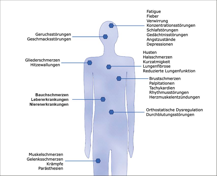 1 Gesamtstaatliche Covid-19-Krisenkoordination: Executive Report der GECKO-Sitzung vom 21. März 2023 2 World Health Organization: Statement on the fifteenth meeting of the IHR (2005) emergency committee on the Covid-19 pandemic. https://www.who.int/news/item/05-05-2023-statement-on-the-fifteenth-meeting-of-the-international-health-regulations-(2005)-emergency-committee-regarding-the-coronavirus-disease-(covid-19)-pandemic ; zuletzt aufgerufen am 29.6.20233 Tran VT et al.: Course of post Covid-19 disease symptoms over time in the ComPaRe long Covid prospectivee-cohort. NatCommun 2022; 13(1): 1812 4 Hayes LD et al.: More than 100 persistent symptoms of SARS-CoV-2 (Long Covid): A scoping review. Front Med 2021; 8: 750378 5 Huang L et al.: 1-year outcomes in hospital survivors with Covid-19: A longitudinal cohort study. Lancet 2021; 398(10302): 747-58 6 Gyöngyösi M et al.: Long Covid and the cardiovascular system-elucidating causes and cellular mechanisms in order to develop targeted diagnostic and therapeutic strategies: A joint scientific statement of the ESC working groups on cellular biology of the heart and myocardial and pericardial diseases. Cardiovasc Res 2023; 119(2): 336-56 7 Xie Y et al.: Long-term cardiovascular outcomes of Covid-19. Nat Med 2022; 28(3): 583-90 8 Puntmann VO et al.: Long-term cardiac pathology in individuals with mild initial Covid-19 illness. Nat Med 2022; 28(10): 2117-23 9 Premraj L et al.: Mid and long-term neurological and neuropsychiatric manifestations of post-Covid-19 syndrome: A meta-analysis. J Neurol Sci 2022; 434: 120162 10 Tuncer G et al.: Long-term effects of Covid-19 on lungs and the clinical relevance: a 6-month prospective cohort study. Future Microbiol 2023; 18: 185-98 11 Xu E et al.: Long-term gastrointestinal outcomes of Covid-19. Nat Commun 2023; 14(1): 983 12 Vakili K et al.: The contribution of gut-brain axis to development of neurological symptoms in Covid-19 recovered patients: A hypothesis and review of literature. Front Cell Infect Microbiol 2022; 12: 983089 13 Wrona M, Skrypnik D: New-onset diabetes mellitus, hypertension, dyslipidaemia as sequelae of Covid-19 infection—systematic review. Int J Environ Res Public Health 2022; 19(20): 13280