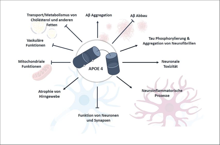 Abb. 2: Pathophysiologische Wirkmechanismen von APOE4 in der Alzheimererkrankung. APOE4 beeinflusst zahlreiche neurobiologische Prozesse, die zur Alzheimerpathogenese beitragen