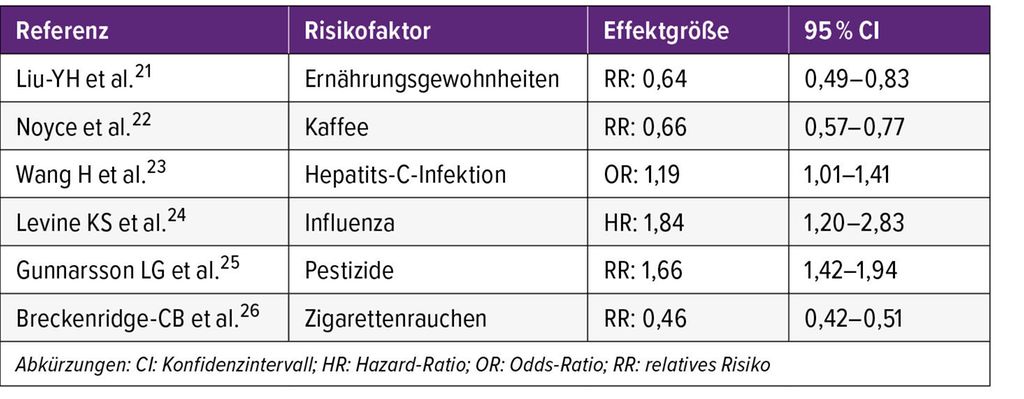Erfreulich ist, so Seppi, dass die PD mit beeinflussbaren „Risikofaktoren“ einhergeht. Eine Metaanalyse bei 544336 Menschen zeigte, dass Personen, die mindestens mäßiggradige körperliche Aktivität betreiben, ein etwa 20% beziehungsweise 30% niedrigeres Risiko haben, innerhalb von 12 Jahren an PD zu erkranken.20 Eine Auswahl weiterer modifizierbarer Risikofaktoren ist in Tabelle 1 dargestellt.