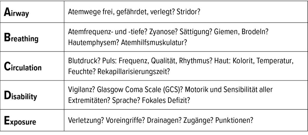 Nach dem ABCDE-Schema vorgehen: Airway, Breathing, Circulation, Disability, Exposure.