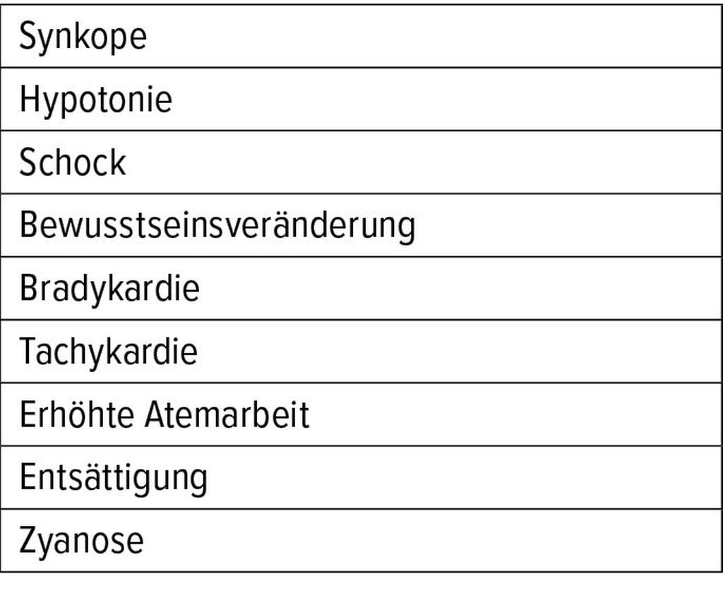 Auf „red flags“ achten: Synkope, Hypotonie, Schock, Bewusstseinsveränderung, Brady- oder Tachykardie, erhöhte Atemarbeit, Entsättigung, Zyanose.