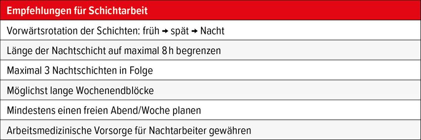 In allen deutschsprachigen Ländern haben Nachtarbeiter die Pflicht oder zumindest das Angebot, regelmässige arbeitsmedizinische Untersuchungen und Beratungen auf Kosten des Arbeitgebers wahrzunehmen. Aber nicht nur Arbeitsmediziner müssen sich um die mit Schichtarbeit verbundenen Fragen kümmern, auch Ärzte in der Grundversorgung und Internisten sollten ihre Patienten bezüglich ihrer Erwerbsarbeit befragen und beraten. Dazu gehören das Wissen über die gesundheitlichen Folgen von Schicht- und Nachtarbeit, wie oben beschrieben, und der Gedanke an eine mögliche kausale Beziehung präsentierter Beschwerden zu diesem Arbeitssystem. Erfragen Sie bei der Berufsanamnese systematisch Schichttyp (rotierend vs. fest), Beginn/Ende, Schichtdauer, Anzahl aufeinanderfolgender Nachtschichten, Dauer der beruflichen Exposition (Jahre), Schlafdauer/Qualität, Tagesmüdigkeit, Gebrauch von schlaffördernden Medikamenten, Unfälle sowie die Auswirkung auf soziale Aktivitäten. Eine klinische Untersuchung sollte die Durchführung einer kurzen körperlichen Untersuchung mit Befunddokumentation (u.a. Körpergrösse, Gewicht, Blutdruck, klinische Befunde) beinhalten. Die klinische Laboruntersuchung sollte mindestens die Parameter zur Bestimmung des kardiovaskulären Risikos und des Zuckerhaushalts (Cholesterin mit Differenzierung zwischen HDL und LDL, Triglyzeride, Nüchternglukose, HbA1c) umfassen.7 In der Beratung sollte darauf aufmerksam gemacht werden, dass es eine komplette körperliche Gewöhnung an die Schichtarbeit nicht gibt und gewisse Beschwerden, insbesondere Schlafstörungen, daher nicht ungewöhnlich sind. Wichtig ist das Gefühl einer Erholung während der Freischicht; wenn diese Erholung nicht gewährleistet ist, droht die Entwicklung eines Schichtarbeitersyndroms. Nach einer Nachtschicht sollten keine aufregenden Nachrichten oder Filme geschaut und es sollte – eventuell nach einer leichten Mahlzeit – zum Schlafen bald ein vor Lärm geschützter Ruheraum aufgesucht werden. Das Einwirken von Tageslicht sollte durch lichtdichte Vorhänge verhindert werden. Eine zweite Schlafphase am Nachmittag wird von vielen Betroffenen praktiziert und geschätzt.