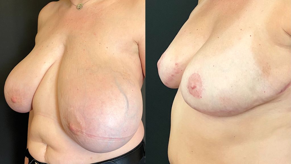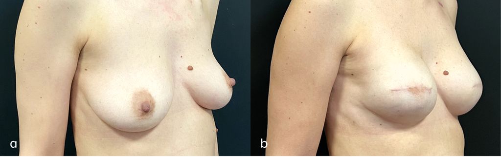 Fig. 1: Avant et après une skin-reducing mastectomy bilatérale et reconstruction immédiate par prothèses avec projection modérée et greffes libres de PAM.