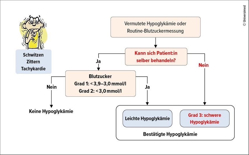 Von einer Hypoglykämie spricht man bei einem Blutzucker ≤3,9mmol/l (Grad 1: <3,9 und ≥3,1mmol/l; Grad 2: <3,0mmol/l). Eine schwere oder sogenannte Grad-3-Hypoglykämie liegt unabhängig vom Blutzuckerwert vor, wenn sich der/die Betroffene nicht mehr selber behandeln kann (Abb. 1).2,3
