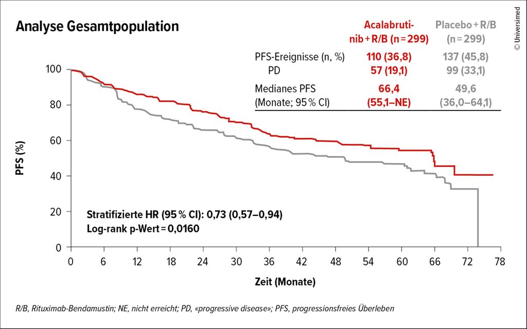 Die Hinzunahme von Acalabrutinib führte in der ECHO-Studie zu einer signifikanten Verlängerung des progressionfreien Überlebens (PFS) verglichen mit dem Kontrollarm (R/B und Placebo) mit einer HR von 0,73 (95% CI: 0,57–0,94) (Abb.2). Dieser Benefit erstreckte sich auch über Hochrisiko-Subgruppen (z.B. mit Bulk, Ki-67 ≥30%, blastoide Morphologie). Basierend auf den Resultaten der ECHO-Studie erfolgte die Zulassung durch die EMA und durch Swissmedic für Acalabrutinib in Kombination mit R/B-Induktion und R-Erhaltung.