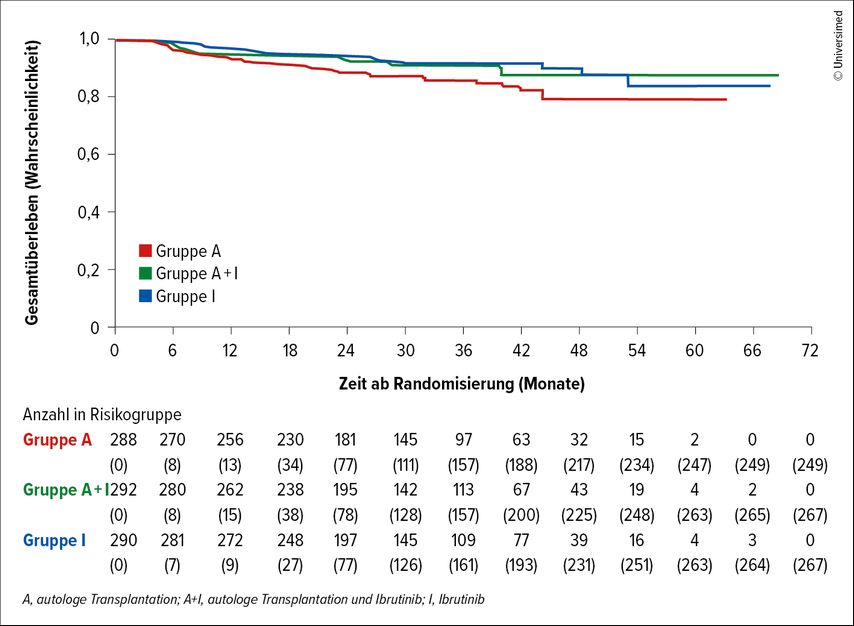 Dieses Konzept wird durch die Resultate der TRIANGLE-Studie verändert.4 Die Studie randomisierte transplantationsfähige Patient:innen in drei verschiedene Behandlungsarme: Immunchemotherapie als Induktion gefolgt von autologer Stammzelltransplantation, Immunchemotherapie+Ibrutinib gefolgt von ASCT und zweijähriger Ibrutinib-Erhaltungstherapie oder Immunchemotherapie+Ibrutinib ohne ASCT, gefolgt von zweijähriger Ibrutinib-Erhaltungstherapie. Die Rituximab-Erhaltungstherapie war zur Zeit der Konzeption der TRIANGLE-Studie noch kein Therapiestandard, somit auch nicht Teil des Studienprotokolls und wurde je nach nationalem Standard bei der Mehrzahl der Patient:innen in allen drei Armen gleich häufig durchgeführt. In beiden Ibrutinib-haltigen Behandlungsarmen zeigten sich statistisch signifikante und relevante Verlängerungen des «failure-free survival» (FFS) und des Gesamtüberlebens (OS) verglichen mit der Standard-Immunchemotherapie gefolgt von ASCT: Die 3-Jahres-FFS-Rate lag bei 88% bzw. 86% vs. 72% und die 3-Jahres-Gesamtüberlebensrate bei 91% bzw. 92% vs. 86% (Abb.1).4 Für die frühere Standardtherapie mit ASCT (ohne Ibrutinib) konnte im Vergleich zum Therapiearm mit Ibrutinib ohne ASCT keine Überlegenheit nachgewiesen werden.4