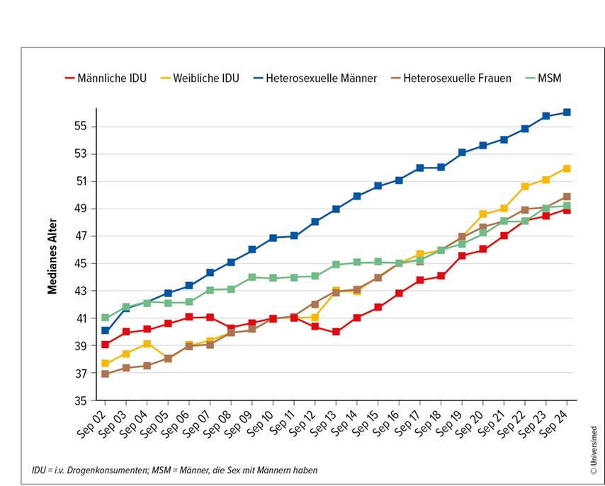 Mit dem medizinischen Fortschritt der letzten Jahrzehnte hat sich die Prognose für Menschen mit HIV dramatisch verbessert. Dank der ART ist HIV heute bei guter Adhärenz eine behandelbare chronische Erkrankung. Menschen mit HIV haben heute eine nahezu normale Lebenserwartung, sofern sie frühzeitig diagnostiziert werden und regelmässig medizinisch betreut sind.1 Diese Entwicklung hat zur Folge, dass immer mehr Menschen, die mit HIV leben, in ein höheres Lebensalter kommen. In der AHIVCOS betrug das mediane Alter im Jahr 2002 39,2 Jahre, im September 2024 waren es bereits 50,8 Jahre.2 In Europa sind laut aktuellen Daten bereits rund 50% der Menschen mit HIV über 50 Jahre alt, in einigen urbanen Regionen liegt dieser Anteil sogar noch höher.3 Die Herausforderungen, die sich dadurch ergeben, sind vielschichtig: Sie reichen von medizinischen Komplikationen über psychosoziale Belastungen bis hin zu Versorgungsstrukturen, die auf diese Patient:innengruppe noch nicht vorbereitet sind.