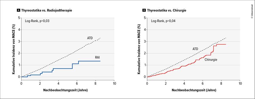 Eine Kohortenstudie mit mehr als 100000 Patient:innen mit neu diagnostizierter Hyperthyreose verglich die medikamentöse Behandlung (Thionamid) mit der Radiojodtherapie und der Chirurgie.14 Primäre Endpunkte waren schwerwiegende kardiale Ereignisse (MACE: kardiovaskulär bedingter Tod, nichttödlicher Myokardinfarkt, nichttödlicher Schlaganfall) und die Gesamtsterblichkeit. Bezüglich MACE schnitten Medikamente schlechter ab als Radiojod und Chirurgie (Abb. 1). Ähnlich waren die Ergebnisse bei der Gesamtsterblichkeit.14 Auf Basis der langfristigen kardiovaskulären Ergebnisse und der Sterblichkeit sind nach Meinung des Experten Chirurgie oder Radiojodtherapie noch immer die bevorzugten Behandlungsoptionen bei hyperfunktionellen Knoten.