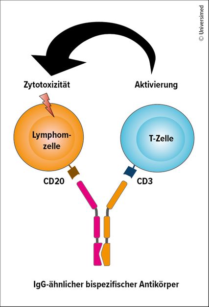 Die bispezifischen Antikörpern haben in der Lymphomtherapie massiv an Bedeutung gewonnen und den Behandlungsalgorithmus neu definiert. Sowohl als Monotherapien im Rezidiv eines grosszelligen Lymphoms als auch in der Kombinationsbehandlung mit einer Immun-Chemotherapie führen sie zu einem guten Ansprechen und nach Erreichen einer kompletten Remission zu einer langen progressionsfreien Zeit.