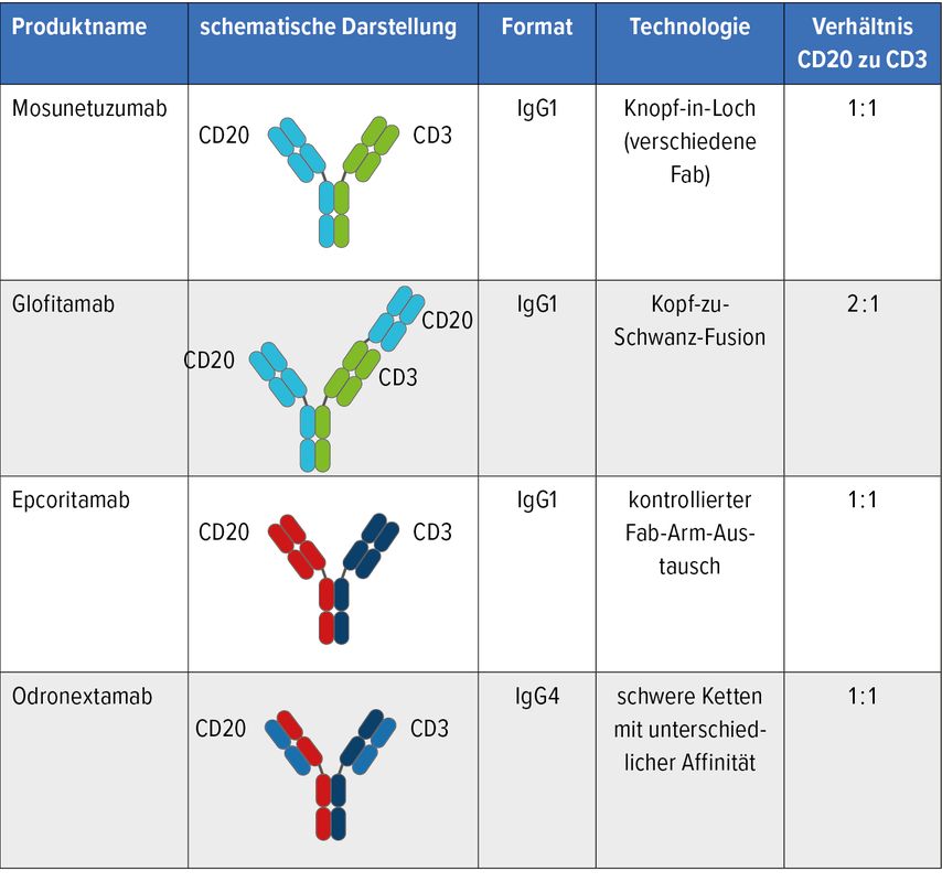Die bispezifischen Antikörper (Glofitamab, Epcoritamab, Odronextamab) mit den beiden Anknüpfungsstellen auf dem T-Zell-Rezeptor CD3 und dem B-Zell-Rezeptor CD20 sind für grosszellige B-Zell Lymphome abschliessend getestet. In anderen Entitäten der aggressiven B-Zell-Lymphome, wie beispielsweise beim Mantelzell-Lymphom, sind bisher Daten aus einer Phase-I/II-Studie mit einer kleinen Population vorliegend.3