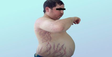Fig.1: Caractéristiques cutanées typiques du syndrome de Cushing: vergetures rouges, peau parcheminée (source: El Aziz S et al.: Apport de l’orientation clinique dans le diagnostic des hypertensions artérielles endocriniennes. Pan African Medical Journal 2014; 18: 171. Sous licence Creative Commons Attribution 4.0 International [CC BY 4.0])
