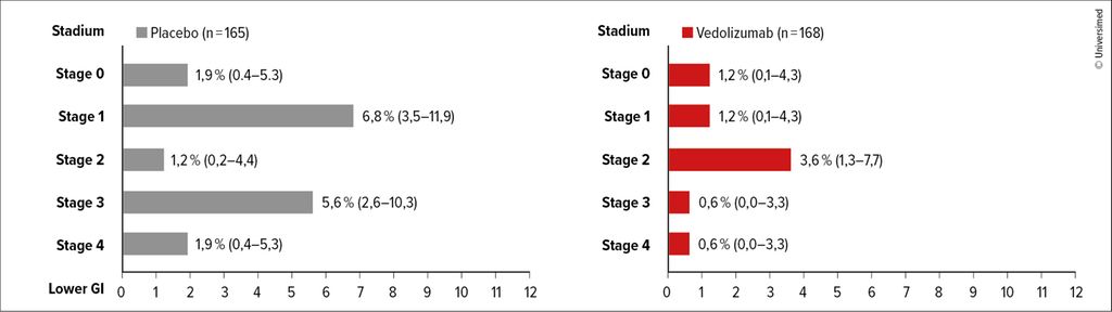 Abb. 1: Raten einer akuten GVHD im unteren Gastrointestinaltrakt im Placebo- sowie im Vedolizumab-haltigen Studienarm nach maximalem klinischem Stadium5