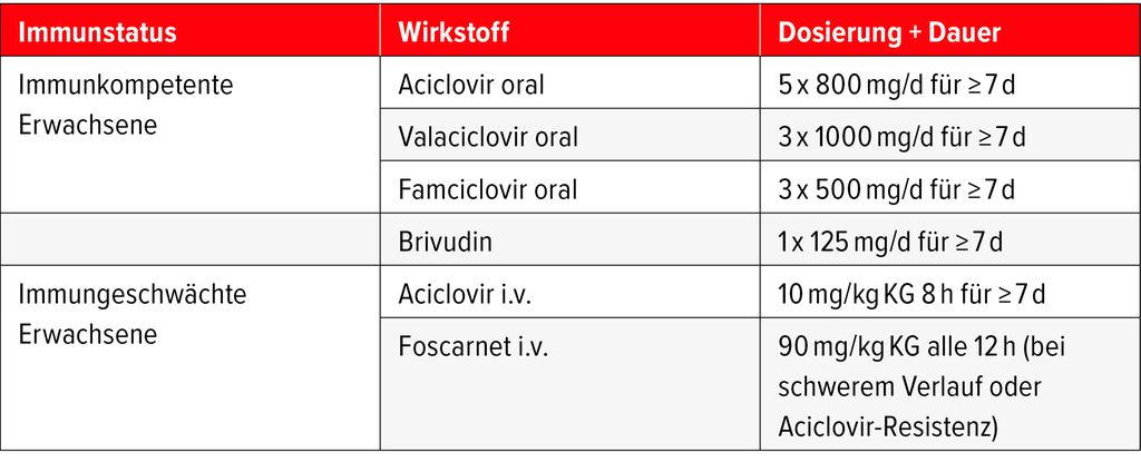 Die Therapie besteht neben kalten Kompressen und Analgesie, gegebenenfalls topischen Antibiotika und topischen und/oder systemischen Kortikosteroiden, vor allem in der möglichst frühzeitigen (<72h) oralen oder systemischen antiviralen Behandlung (Tab.1).4