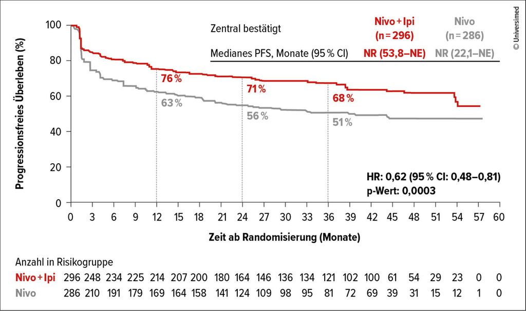Die mediane Behandlungszeit mit Nivolumab+Ipilimumab betrug 20,5 Monate vs. 16,4 Monate mit Nivolumab-Monotherapie. Das PFS wurde durch die zusätzliche Ipilimumab-Gabe klinisch relevant und statistisch signifikant verlängert (HR: 0,62; 95% CI: 0,48–0,81; p=0,0003; Abb.2). Die PFS-Raten lagen bei 76% vs. 63% nach zwölf Monaten, 71% vs. 56% nach 24 Monaten und 68% vs. 51% nach 36 Monaten. Im Median lebten Patient:innen mit bestätigtem MSI-H/dMMR mCRC (81–84% aller randomisierten Erkrankten) im Nivolumab-Monotherapie-Arm 39,3 Monate progressionsfrei. Im Kombinationsarm wurde das mediane PFS noch nicht erreicht.