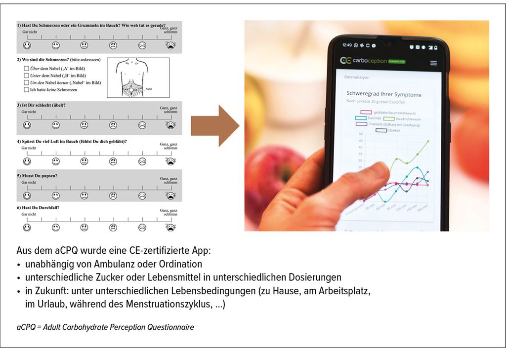 Die App „Carboception“ wurde auf der Basis des aCPQ entwickelt, um Patien-t:innen mit Malabsorption und Intoleranzen, Primärärzt:innen und Diätolog:innen eine strukturierte Möglichkeit zur Erfassung und Analyse ihrer Symptome zu bieten. Mithilfe von validierten Symptomskalen können Betroffene dokumentieren, welche Lebensmittel zu Beschwerden führen. Diese Daten ermöglichen eine personalisierte Anpassung der Diät und verbessern die Kommunikation zwischen Patient:innen und behandelnden Ärzt:innen sowie Diätolog:innen (Abb. 2).