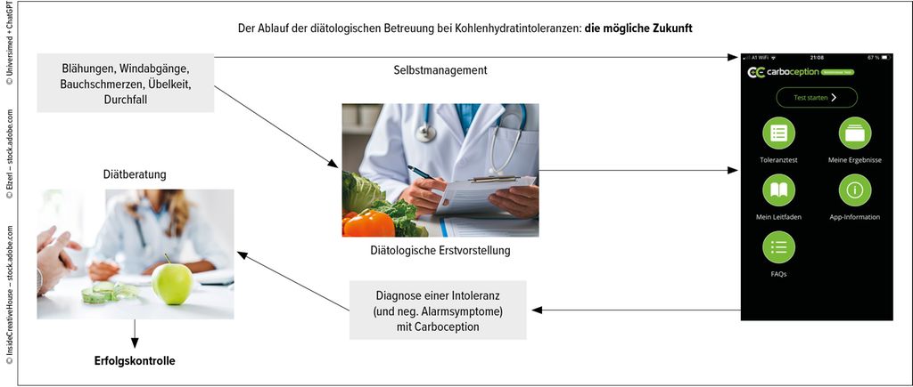 Abb. 2: Zukünftiger Behandlungspfad der Abklärung einer vermuteten Kohlenhydratintoleranz unter Verwendung der „Carboception“-App