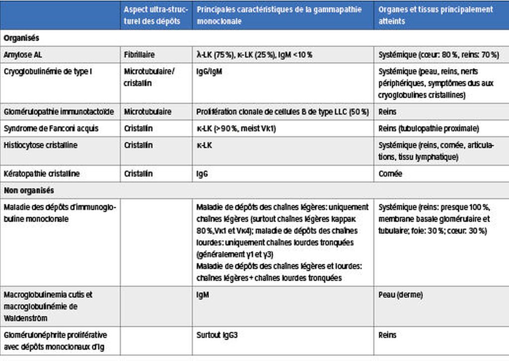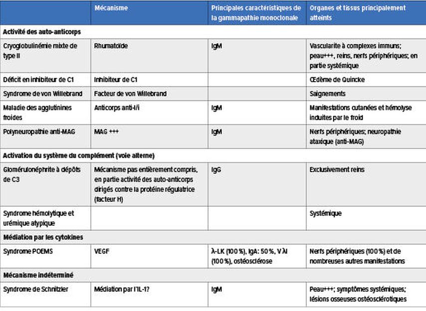 LaMGCS regroupe un ensemble de maladies rares aux manifestations très hétérogènes dues à une lésion organique ou tissulaire. Celle-ci est provoquée par la protéine monoclonale produite par un petit clone agressif de cellules B/plasmocytes via différents mécanismes physiopathologiques, dont certains sont encore indéterminés. La protéine pathologique peut entraîner des lésions organiques et tissulaires par le biais de dépôts organisés ou non dans les organes et les tissus, par l’activité des auto-anticorps, par l’activation du système du complément par la voie alterne ainsi que par la médiation des cytokines (Tab.1 & 2).3–5