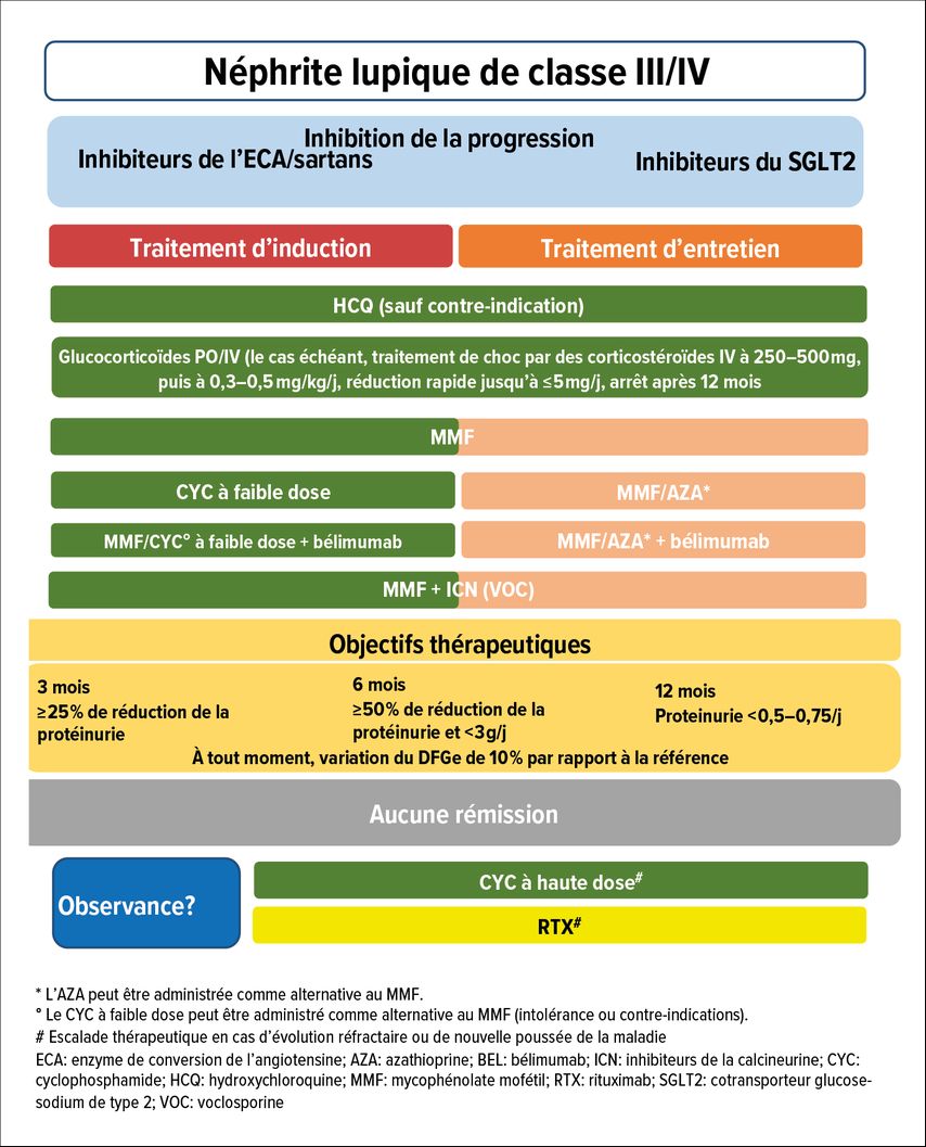 Un traitement combiné multimodal est désormais recommandé pour la NL de classe III et IV. Le mycophénolate mofétil (MMF) et les corticostéroïdes restent la base du traitement de première ligne recommandé et peuvent être complétés de manière individualisée soit par le cyclophosphamide (CYS), le bélimumab ou la voclosporine. Cette dernière est uniquement autorisée en association avec le MMF. Le bélimumab peut être combiné soit au MMF soit au CYS en trithérapie (Fig. 3).5