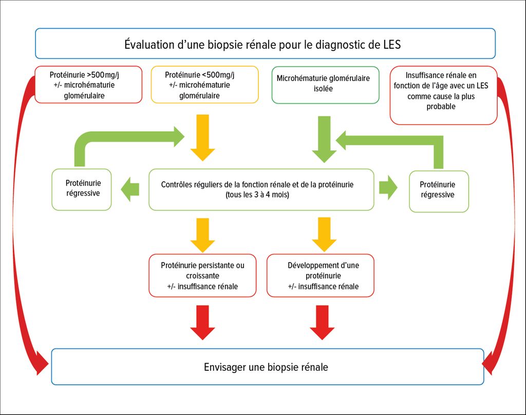 Fig. 2: Algorithme d’évaluation de la nécessité d’une biopsie rénale au moment du diagnostic du lupus érythémateux systémique (LES), sur la base des recommandations internationales de traitement néphrologique (KDIGO 2024 Clinical Practical Guidelines for the Management of Lupus Nephritis)5