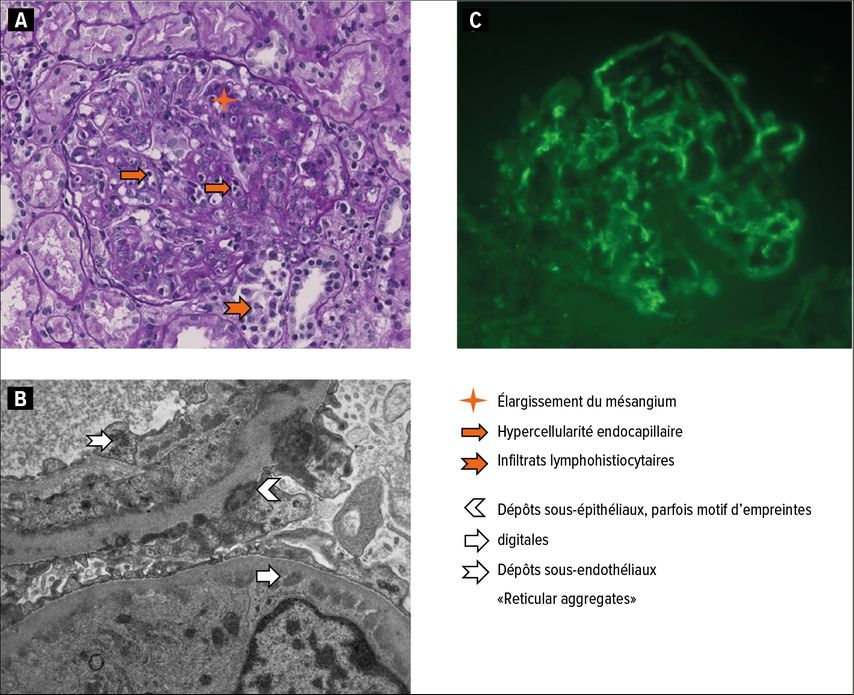 Fig. 1: Les coupes histologiques montrent une néphrite lupique de classe IV et V avec (A) hypercellularité endocapillaire et infiltrat lymphohistiocytaire interstitiel en microscopie optique (MO) ainsi que (B) dépôts denses aux électrons classiques sous-endothéliaux et sous-épithéliaux et «reticular aggregates» en microscopie électronique (ME). (C) À titre d’exemple de la forte positivité de l’immunofluorescence (IF) dans toutes les analyses (IgG, IgA, chaînes légères libres kappa et lambda, facteur du complément C3 et antigène C1q selon le schéma classique «full house»), l’IF pour les IgG