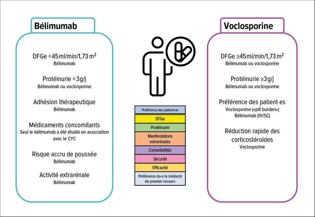 Fig. 4: Choix du traitement multicible. Comparaison des options thérapeutiques actuellement disponibles pour l’utilisation d’un traitement multicible. Utilisation privilégiée du bélimumab en cas de débit de filtration glomérulaire estimé (DFGe) <45ml/min/1,73m2, d’activité extrarénale élevée, de risque accru de poussée et de problèmes d’adhésion. Administration privilégiée de voclosporine en cas de protéinurie >3g/j et de nécessité de réduire rapidement les corticostéroïdes (adaptée selon Frangou E et al. 2024)23