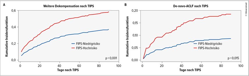 Abb. 1: Wahrscheinlichkeit des Auftretens einer weiteren Dekompensation (A) sowie eines De-novo-ACLF (B) nach TIPS (unter Berücksichtigung von Tod und Lebertransplantation als konkurrierende Risiken) innerhalb von 90 Tagen (kumulative Inzidenzfunktion) bei FIPS-Hochrisiko- sowie Niedrigrisikopatient:innen (modifiziert nach Sturm L et al. 2025)1