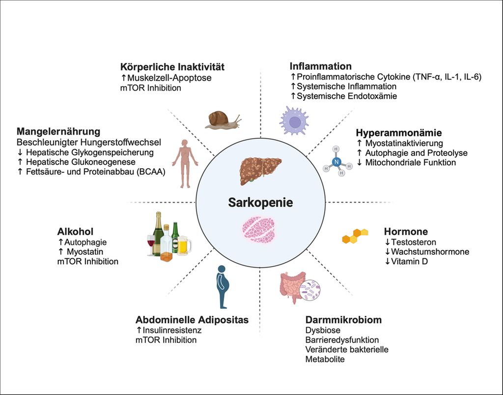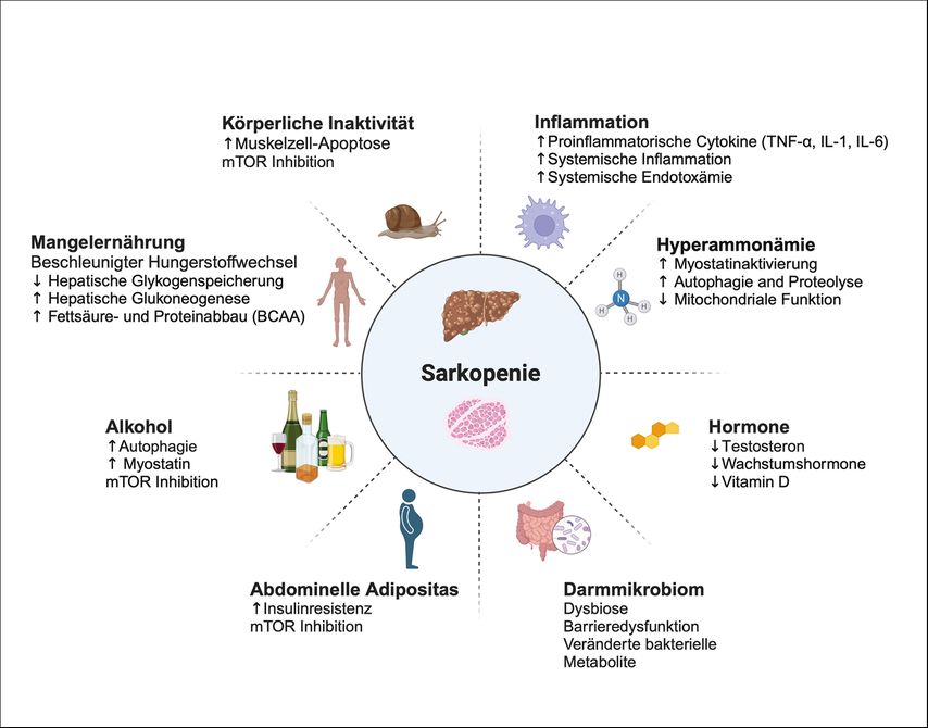 Die Pathogenese ist multifaktoriell (Abb. 2), bei Patient:innen mit Leberzirrhose spielen unter anderem das Vorliegen einer Hyperammonämie, Inflammation, gesteigerte Autophagie und das Vorhandensein einer hormonellen Imbalance (Insulinresistenz, Testosteron- oder Wachstumshormonmangel) eine Rolle.4