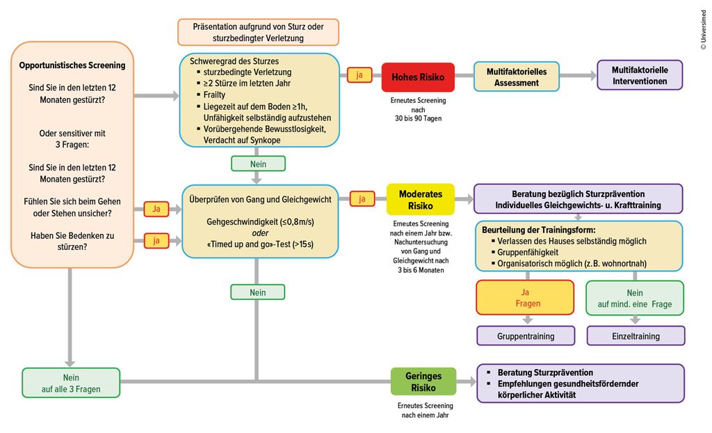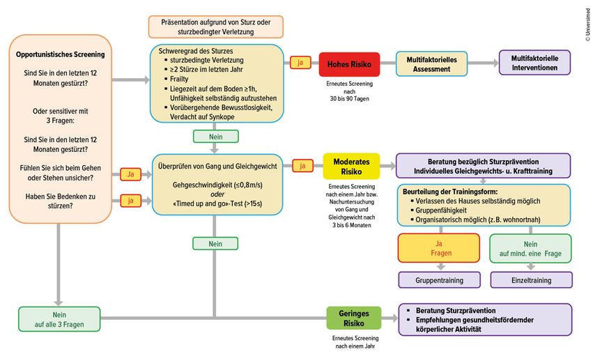 Deshalb ist ein frühzeitiges Screening zur Bestimmung des Sturzrisikos bei älteren Menschen indiziert. Bei hohem Sturzrisiko wird ein multifaktorielles Assessment zur Identifizierung und Behandlung der bestehenden Risikofaktoren empfohlen.