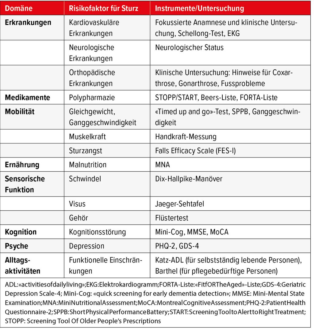 Das multifaktorielle Sturzassessment beinhaltet die folgenden Domänen: kardiovaskuläre, neurologische und orthopädische Erkrankungen, Medikamente, Gang und Gleichgewicht, Muskelkraft, Sturzangst, Ernährung, Schwindel, Visus und Gehör, das Vorliegen einer Kognitionsstörung oder einer Depression. Im Rahmen des Sturzassessments sollte auch die Perspektive der betroffenen Person hinsichtlich Stürzen, deren Ursachen und Prävention eingeholt werden, um einen möglichst effektiven Präventionsplan zu erstellen.