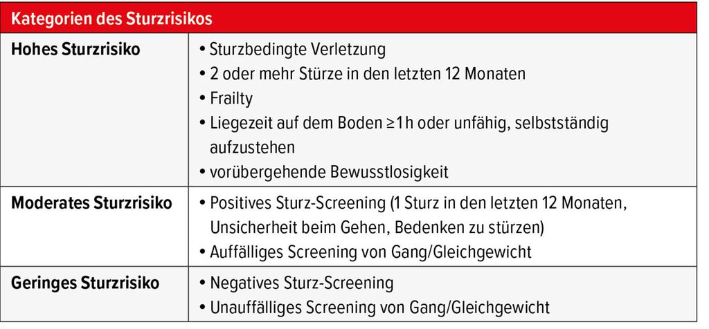 Die Bestimmung des Sturzrisikos ist wichtig, um festzustellen, ob weitere Abklärungen nötig sind, und um individuelle Massnahmen zur Sturzprävention einzuleiten. Tabelle 1 gibt einen Überblick über die Sturzrisiko-Kategorien.