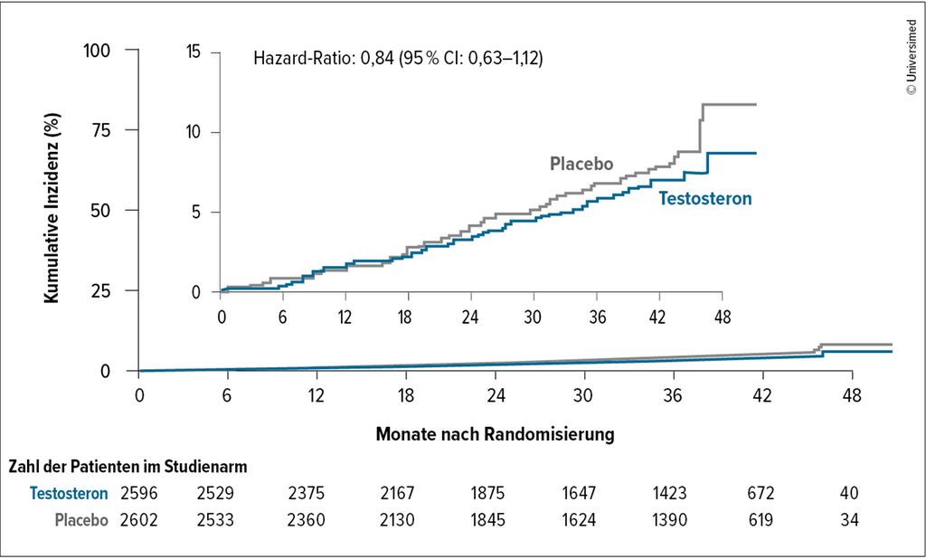 Mit der Publikation der TRAVERSE-Studie 2023 im NEJM mit dem Titel „Cardiovascular Safety of Testosterone-Replacement Therapy“ sollte sich die Datenlage zugunsten der Sicherheit der TRT jedoch deutlich ändern. Publiziert von Michael Lincoff et al.15 lag nun endlich eine methodisch solide Studie vor. Die bisher größte prospektive randomisierte, placebo-kontrollierte Nichtunterlegenheitsstudie zeigte keine Zunahme schwerer KV Ereignisse („major adverse cardiovascular events“; MACE) im Vergleich zu Placebo. Die Hazard-Ratio für das primäre KV Studienziel lag bei knapp 1, das Ziel der Nichtunterlegenheit wurde somit erreicht. Es wurden 5246 Männer im Alter von 45–80 Jahren rekrutiert. Alle eingeschlossenen Patienten litten an einem klinisch relevanten Hypogonadismus mit laborchemisch bestätigten niedrigen Testosteronwerten (<300ng/dl). Zusätzlich war eine vorbestehende KV Erkrankung oder zumindest ein erhöhtes Risiko für eine KV Erkrankung notwendig für den Einschluss. Anschließend erfolgte die Randomisierung zu transdermalem Testosteron-Gel oder Placebo, welches je nach Testosteronwert dosisadaptiert wurde. Die Datenerhebung erfolgte über einen mittleren Beobachtungszeitraum von 2–3 Jahren (33,0 ± 2,1).