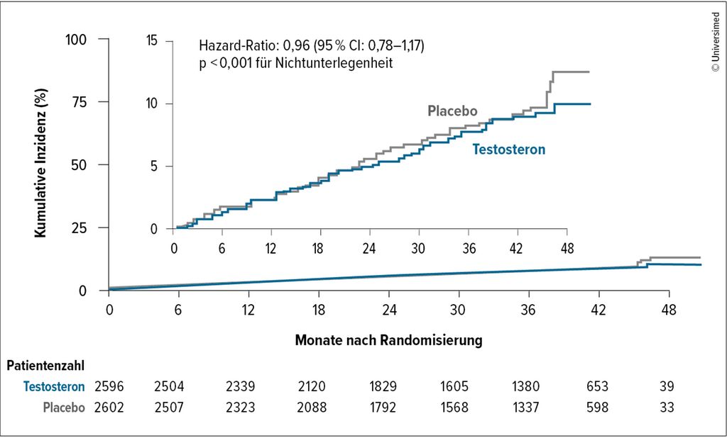 Auch bei kardiovaskulär mitunter stark vorbelasteten Patienten ist eine TRT sicher und effektiv. Der positive Effekt auf Libido und Sexualität, aber auch auf weitere Symptome des Hypogonadismus wurde wiederum bestätigt. Die immer noch verbreitete Sorge vor einer erhöhten Prostatakarzinominzidenz konnte erneut widerlegt werden.