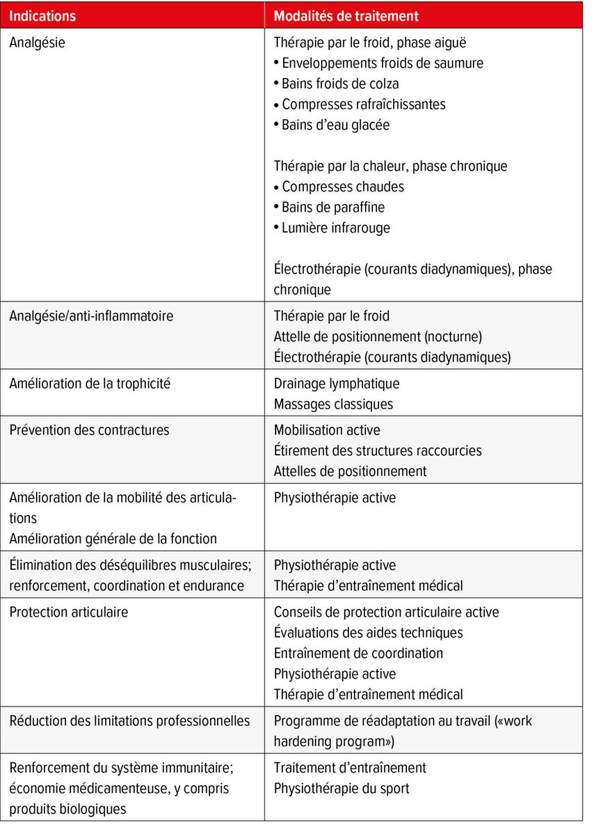 La Figure 1 illustre, sur la base des recommandations de traitement actuelles de l’EULAR pour le traitement de la polyarthrite rhumatoïde2, des indications et une aide pour l’intégration des mesures physiques et physiothérapeutiques tout au long du parcours thérapeutique recommandé. Le Tableau 1 résume les indications et les modalités thérapeutiques.