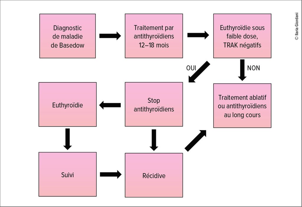 Les recommandations européennes en vigueur (Fig. 1), datant de 2018, préconisent un traitement par antithyroïdiens pendant 12 à 18 mois, stoppé à condition que le taux de la TSH soit dans la norme et que les anticorps anti-TSHR soient négatifs. Un traitement au-delà de 12 à 18 mois peut être pris en considération en alternative au traitement par iode radioactif ou à la chirurgie, en cas de persistance d’hyperthyroïdie.8