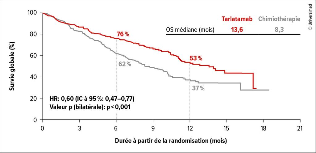 Fig.1: Critère d’évaluation primaire de l’étude DeLLphi-304: avantage de survie sous tarlatamab vs chimiothérapie (modifiée selon Rudin et al.)7
