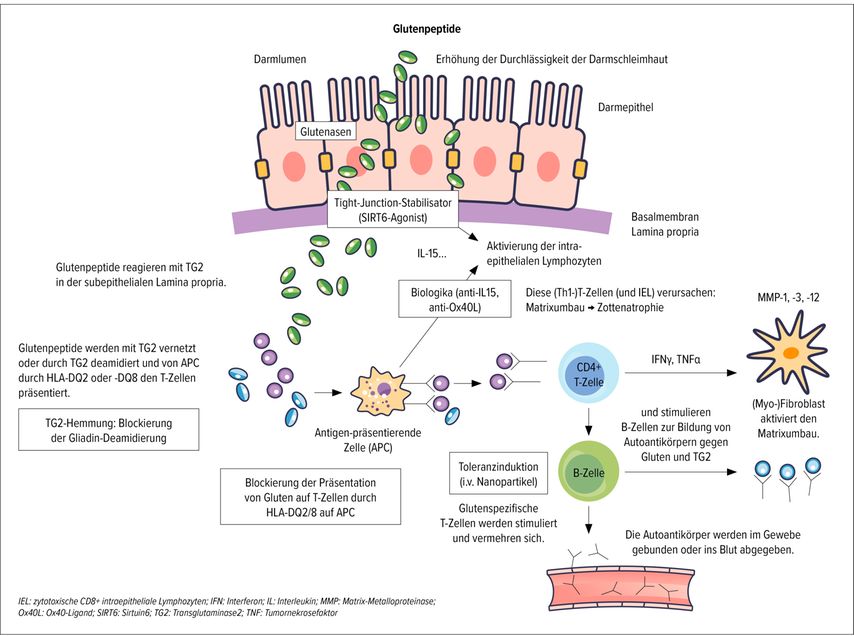 Abb. 1: Pathogenese der Zöliakie im Dünndarm und Ansätze für pharmakologische Therapieoptionen (modifiziert nach Schuppan D et al. 2025)2