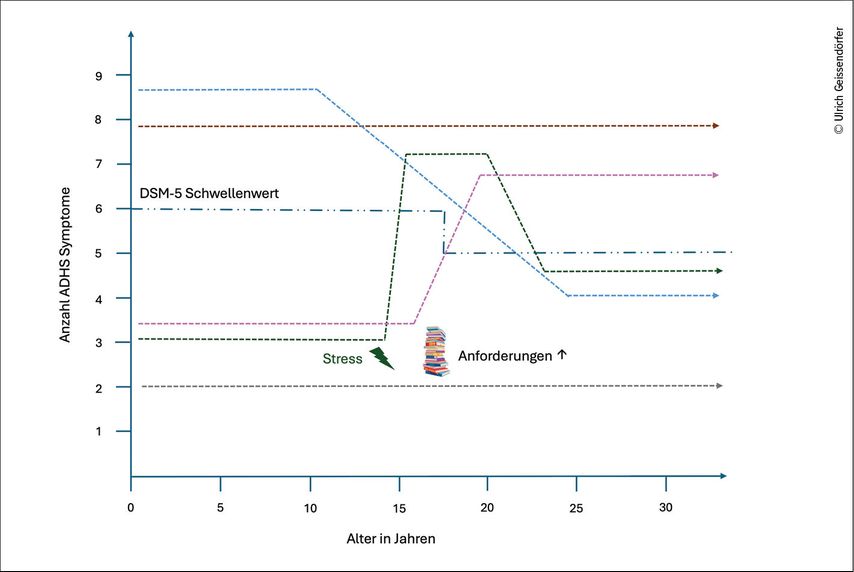 Sofern die Screening-Fragebögen auffällig sind und die Symptomatik typisch ist, kann die Diagnose rasch gestellt werden. Probleme ergeben sich aus der Forderung, die Symptomatik müsse die ganze Kindheit über nachzuvollziehen sein oder über den eingeschränkten Zeitraum der Fragebögen, typischerweise das 8.–10. Lebensjahr. Eine prospektive Studie, welche eine grosse Kohorte zu acht Zeitpunkten im Abstand von jeweils zwei Jahren untersuchte, zeigte, dass bei 60% der ADHS-Betroffenen der Verlauf fluktuierend war.1 Die Diagnosestellung ist dementsprechend abhängig vom Untersuchungszeitpunkt (Abb. 1). Dies zu berücksichtigen, kann die Diagnosestellung erleichtern.