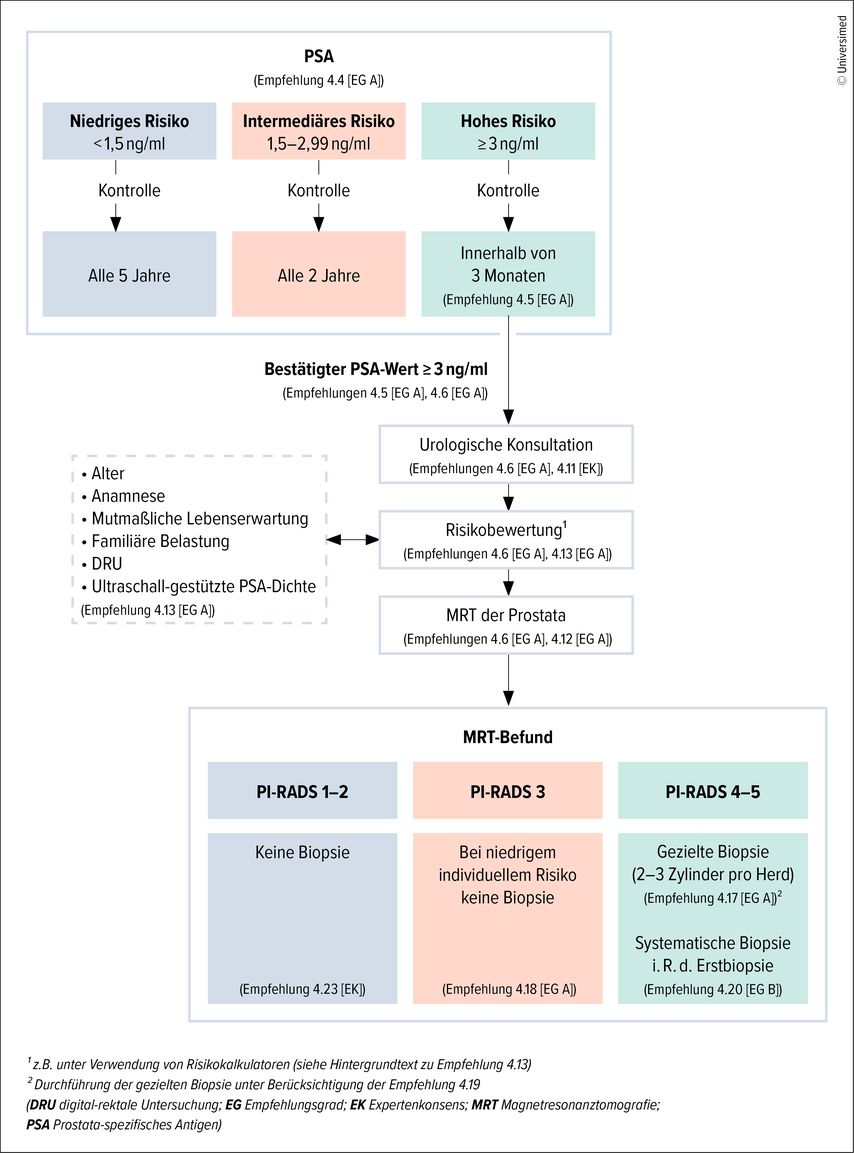 Abb. 2: Algorithmus zur Früherkennung und Diagnostik des Prostatakarzinoms mit Verweis auf ausgewählte Empfehlungen (Leitlinienprogramm Onkologie, Deutsche Krebsgesellschaft, Deutsche Krebshilfe, AWMF, 2025)6