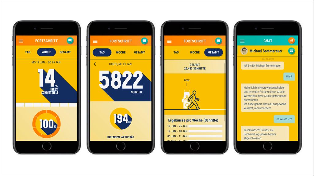 Eine Steigerung der körperlichen Aktivität könnte dazu beitragen, neurodegenerative Prozesse im Frühstadium von α-Synukleinopathien zu verlangsamen. Studien aus Tiermodellen und klinische Untersuchungen weisen darauf hin, dass regelmäßige körperliche Aktivität krankheitsmodifizierende Effekte haben und insbesondere kognitive Funktionen erhalten kann.32,33 Jedoch erreichen viele Personen nicht das von der WHO empfohlene allgemeine Bewegungsniveau.34 Aktuell gewinnen digitale, motivierende Smartphone-Apps an Bedeutung, da sie eine einfache und skalierbare Möglichkeit bieten, körperliche Aktivität im Alltag zu fördern.35 Ziel der ALPHA-FIT-Studie36 ( https://www.dzne.de/forschung/studien/klinische-studien/alpha-fit ) ist es, die Effekte einer gesteigerten körperlichen Aktivität im Alltag auf die kognitiven Funktionen bei Personen mit iRBD und gesunden Kontrollen zu untersuchen. In der randomisierten, doppelblinden und aktiv kontrollierten Studie werden die Teilnehmenden über einen Zeitraum von einem Jahr zur Steigerung der körperlichen Aktivität motiviert. Alle Teilnehmenden erhalten hierzu Zugang zu einer motivationsfördernden Smartphone-App mit Gamification-Elementen (ALPHA-FIT-App, Abb.3), dessen Grundstruktur im Rahmen der Slow-SPEED-Studie37 entwickelt wurde. Die App ist zur kontinuierlichen Aufzeichnung der körperlichen Aktivität (Schrittzahl/Herzfrequenz) mit einer Fitbit-Smartwatch verbunden. Nach einer 4-wöchigen Beobachtungsphase zur Erfassung der Ausgangsaktivität erfolgt die Randomisierung in eine Interventionsgruppe (100%ige Steigerung der körperlichen Aktivität) oder eine aktive Kontrollgruppe (10%ige Steigerung). Über die App können individuell angepasste, zielgerichtete Motivationsmaßnahmen vermittelt sowie die Erreichung der Aktivitätsziele unmittelbar überprüft werden. Primärer Outcome-Parameter ist die Veränderung der kognitiven Leistung über ein Jahr. Neben klassischen neuropsychologischen Tests als primärem Endpunkt werden als sekundäre Endpunkte MRT- und blutbasierte Marker der Hirnalterung untersucht. Die Studie – als Spin-off der Slow-SPEED-Studie37 – wird unter Leitung der Universität Bonn (Michael Sommerauer) in enger Kooperation mit der Radboud-Universität (Sirwan Darweesh) und der Medizinischen Universität Innsbruck (Ambra Stefani) durchgeführt. Insgesamt ist ein gemeinsamer Einschluss von über 250 Personen mit iRBD und 100 alters- und geschlechtsgematchten Kontrollen geplant; die Rekrutierung ist 12/2025 gestartet.