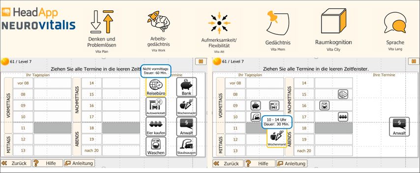 Abb. 2: Digitales, kognitives Training via Tablet/Smartphone-App oder am Computer (HeadApp/NEUROvitalis, HelferApp GmbH)