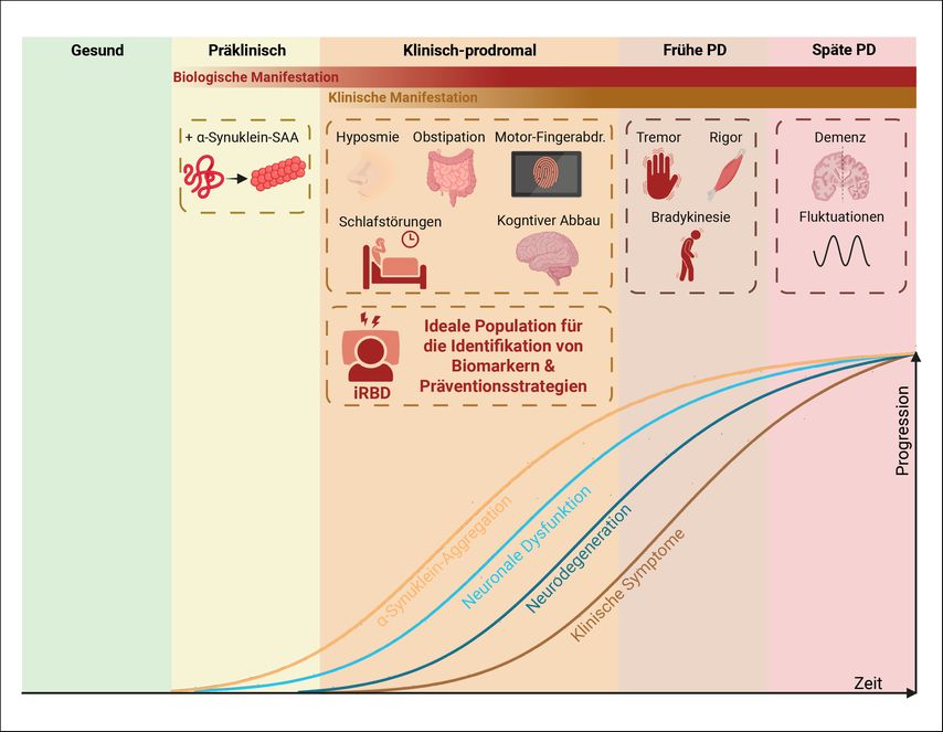 Um Personen mit einem erhöhten Krankheitsrisiko frühzeitig präventive Maßnahmen zukommen lassen zu können, spielt die Früherkennung von entsprechenden Personen eine wesentliche Rolle. Die isolierte REM-Schlaf-Verhaltensstörung (iRBD) ist eine Parasomnie, die durch den Verlust der physiologischen Muskelatonie während des REM-Schlafs und durch Traum-Enactment-Verhalten (z.B. Schlagen, Treten und Schreien) gekennzeichnet ist und mittels Polysomnografie zuverlässig diagnostiziert werden kann.27 Bis zu 90% der Personen mit iRBD entwickeln innerhalb von 20 Jahren nach der Diagnose eine Parkinsonkrankheit, entweder mit reinem motorischem Phänotyp oder auch mit deutlichen kognitiven Einschränkungen – mit einer etwa gleichmäßigen Verteilung zwischen beiden Entitäten.28 In ähnlicher Größenordnung können bereits im Stadium der iRBD α-Synuklein-Aggregate im Liquor oder in Hautbiopsien mittels SAA nachgewiesen werden, sodass die iRBD klinisch ein Prodromalstadium der Parkinsonkrankheit und biologisch eine frühe α-Synukleinopathie darstellt (Abb. 1).29 Als pathophysiologisch ursächlich für den Verlust der REM-Atonie wird die Ablagerung von α-Synuklein-Aggregaten im Locus subcoeruleus angenommen, ohne dass zu diesem Zeitpunkt weiter rostral liegende motorische Zentren wie die Substantia nigra relevant betroffen sind.30 Personen mit einer iRBD stellen daher neben der Identifikation von Früherkennungs-Biomarkern eine besonders geeignete Zielgruppe zur wissenschaftlichen Untersuchung von Lebensstilinterventionen dar.28 Ziel ist es, solche Interventionen zu identifizieren, die das Fortschreiten der Erkrankung in einem frühen Stadium verlangsamen können. Die International RBD Study Group ( https://irbdsg.com ) widmet sich seit vielen Jahren der systematischen Erforschung dieser Erkrankung. An mehreren Zentren weltweit werden mittlerweile große iRBD-Kohorten systematisch betreut – alleine in Bonn unter Leitung von Michael Sommerauer zum Beispiel über 150 Personen. Die prospektive neurologische Begleitung dieser Kohorten bietet insbesondere im Kontext präventiver Strategien einen substanziellen klinischen Nutzen für die Betroffenen.