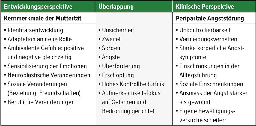 Mit Eintritt einer Schwangerschaft beginnt für eine Frau eine neue Entwicklungsphase, die Transformation von der Frau zur Mutter – bezeichnet als Matreszenz oder Muttertät.11–13 Dieser Prozess ist durch eine Vielzahl an Veränderungen auf körperlicher, psychischer, sozialer und beruflicher Ebene geprägt.13 In diesem Zusammenhang weist die Muttertät Parallelen zur Pubertätsphase auf, welche ebenfalls eine Übergangsperiode zwischen zwei Lebensabschnitten beschreibt.14 Das Konzept der Muttertät hat innerhalb der peripartalen Psychotherapie und Psychiatrie zunehmend an Aufmerksamkeit gewonnen und trägt zur Klärung der Unsicherheit bei, welche sich Fachpersonen und Betroffene gleichermassen stellt: Was sind normale Ängste und ab wann gelten die Ängste als Symptom einer klinischen Diagnose? Mithilfe dieser entwicklungspsychologischen Perspektive kann das bisherige Verständnis der peripartalen psychischen Gesundheit von Müttern bereichert und erweitert werden im Sinne einer ganzheitlichen Betrachtungsweise.11 Auf psychologischer Ebene zählen zu den Kernmerkmalen der Muttertät Gefühle wie Unsicherheit, Zweifel und Ängste, welche in Zusammenhang mit der neuen Verantwortung für das eigene Kind einhergehen und sich auf kognitiver Ebene durch anhaltendes Sichsorgen zeigen können.15 Auf emotionaler Ebene werden in dieser Zeit besonders intensive und auch ambivalente Gefühle erlebt. Gefühle der Liebe und Freude, aber auch Wut oder Traurigkeit kommen gleichzeitig vor. Nehmen Mütter im Erleben oder in Bezug auf die eigenen Gefühle Abweichungen von gesellschaftlich transferierten Idealbildern wahr, entwickeln sie oftmals Gefühle des Versagens sowie Scham- und Schuldgefühle. Ein weiterer Einflussfaktor, der das emotionale Erleben von Schwangeren und Müttern mit beeinflusst, ist die ab dem dritten Trimenon zunehmende emotionale Sensibilisierung. Frauen werden empfindsamer und weisen stärkere emotionale Reaktionen auf.16 Zusätzlich ist der Aufmerksamkeitsfokus in dieser Zeit vermehrt auf das Erkennen möglicher Gefahren gerichtet und alltägliche Fürsorgeaufgaben werden dadurch kritisch oder gar ängstlich betrachtet («Trinkt das Kind genug, entwickelt es sich normal?»).16,17 Diese beschriebenen Ängste und Sorgen treten im Rahmen dieser Entwicklungsphase auf und haben keinen Krankheitswert, aber in der Summe können sie gemeinsam mit anderen Faktoren zu einer erhöhten Ängstlichkeit bei Müttern beitragen.