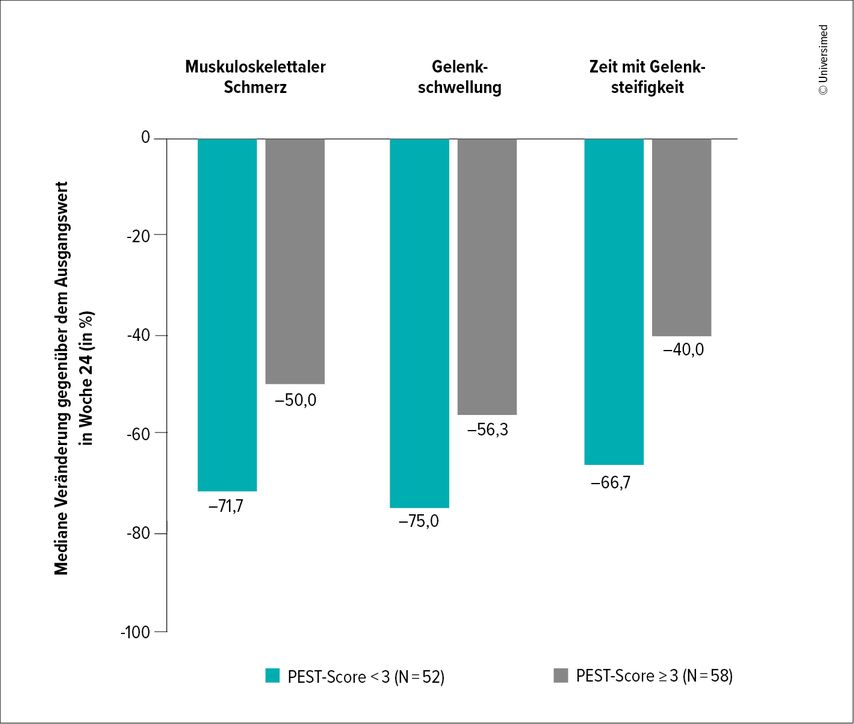 Die aktuelle Auswertung untersuchte die Wirksamkeit von Ixekizumab in der Verbesserung von muskuloskelettalen Symptomen, die mit dem International Dermatology Outcome Measures Musculoskeletal Questionnaire (IDEOM MSK-8) erhoben wurden. Patienten mit diagnostizierter Psoriasis-Arthritis wurden ausgeschlossen. Von den 110 Patienten wiesen 52 einen PEST-Score von <3 auf, 58 hatten einen Score ≥3. Die Auswertung zeigte, dass Pat- ienten mit einem PEST-Score <3 (geringere Wahrscheinlichkeit für Psoriasis-Arthritis) grössere Verbesserungen bei muskulo- skelettalen Symptomen wie Schmerzen, Gelenkschwellungen und Steifheit erzielten als Patienten mit einem PEST-Score ≥3 (Abb.1). Die Verbesserungen wurden über 52 Wochen gemessen.4