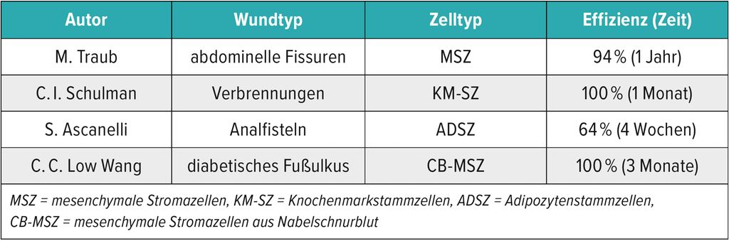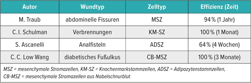 Bisher wurden MSZ zur Verbesserung der Wundheilung klinisch wenig angewandt. Wie aus Tabelle 1 ersichtlich, sind die Indikationen sehr unterschiedlich und die Nachbeobachtungszeiten sehr kurz.