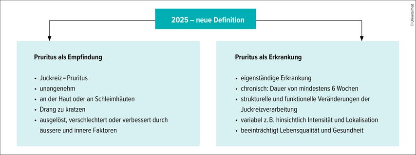 Samuel Hafenreffer beschrieb Pruritus 1623 in einer ersten medizinischen Definition als eine unangenehme Sensation, die den Drang auslöst, sich zu kratzen. Die Kritik an dieser alten Definition bestand seit einiger Zeit darin, dass ein klarer Krankheitsaspekt fehlte und dass die Abgrenzung zum Schmerz unklar war. Im neuen internationalen Delphi-Konsensus1 wird Pruritus sowohl als Empfindung als auch als Erkrankung definiert (Abb.1), was die Grundlage für eine in Analogie zur Schmerzmedizin eigene Pruritusmedizin darstellt: