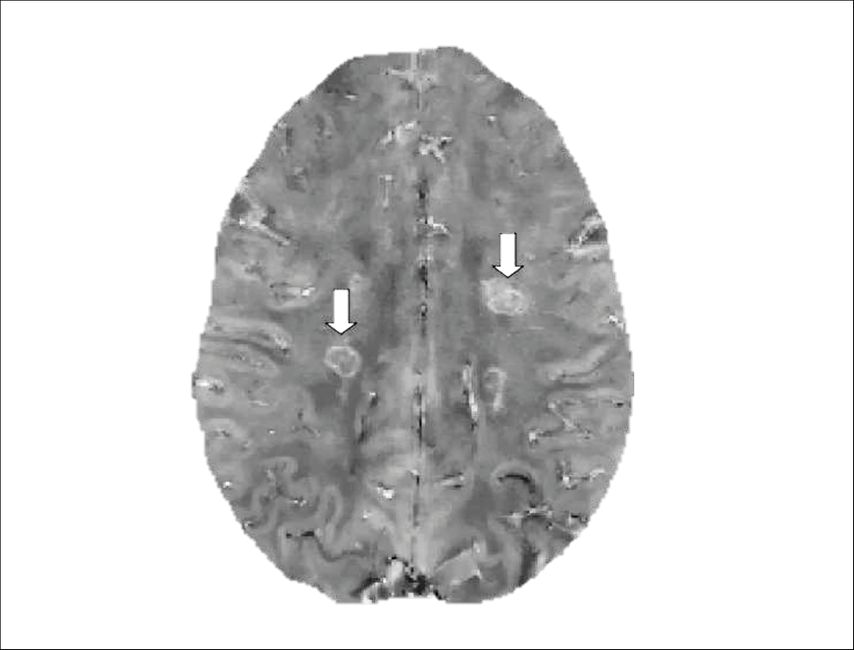 Fig. 1: Example of paramagnetic rim lesions (PRLs) on quantitative susceptibility mapping (QSM). PRLs are indicated by arrows and are characterized by a hyperintense rim reflecting iron accumulation (image modified from Cagol et al. 2023)8