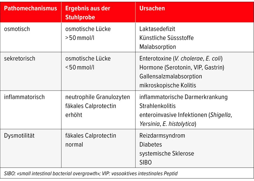 Tab. 1: Jedem Pathomechanismus liegen typische Ursachen zugrunde. Aufschluss gibt die Analyse der Stuhlprobe (modifiziert nach Stamm GM et al 2022)1